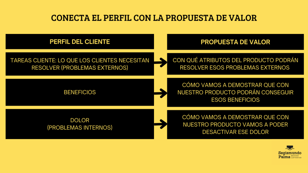 De la investigación con tu copywriter habéis perfilado a tu cliente potencial. Y aunque la investigación debe aportar más aristas, para la propuesta de valor está bien sintetizarlo en tres bloques…